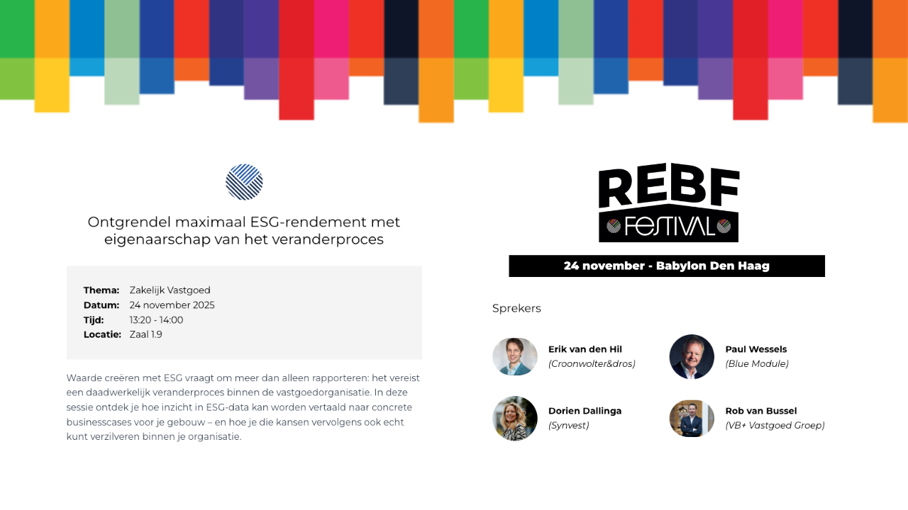 Blue Module is tijdens het festival ook aanwezig op het REBF Kennisplein, waar we deelnemers praktisch laten zien hoe je ESG-data inzet voor prestatieverbetering en waardecreatie.